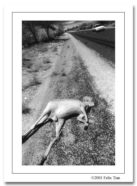 五个小时后,我在路边看到了一个被汽车撞死的袋鼠和一头已经腐烂的牛尸体。那袋鼠的生殖器和翻露在外的鲜红骨髓在烈日下显得格外凄惨。我下车,顶着恶臭拍了几张片子。一天之后,当我从Ayers Rock照完落日返回再次经过此地时,发现在那头牛的尸体前后不到一英里的范围内竟然增多了五头牛的尸体,我才霍然明白了为什么所有的卡车前面都装备着保险杠。在澳洲,这东西可真真的不是装饰品。