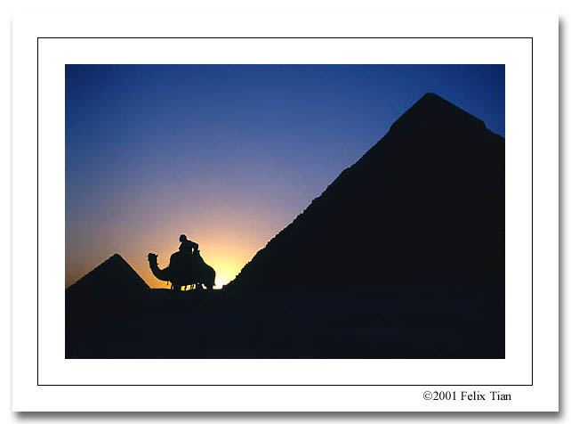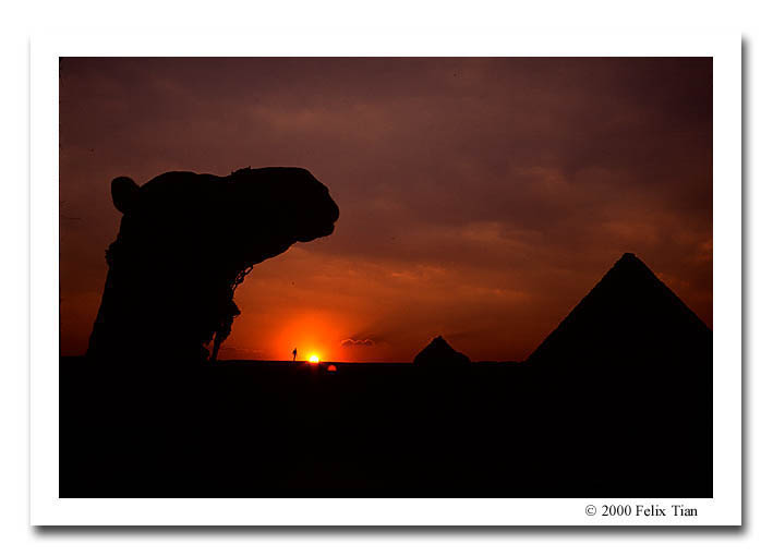 伙计牵着骆驼穿过了一大片穆斯林坟地,眼前豁然开朗,胡夫三塔巍然屹立。大漠斜阳,古韵沧桑。