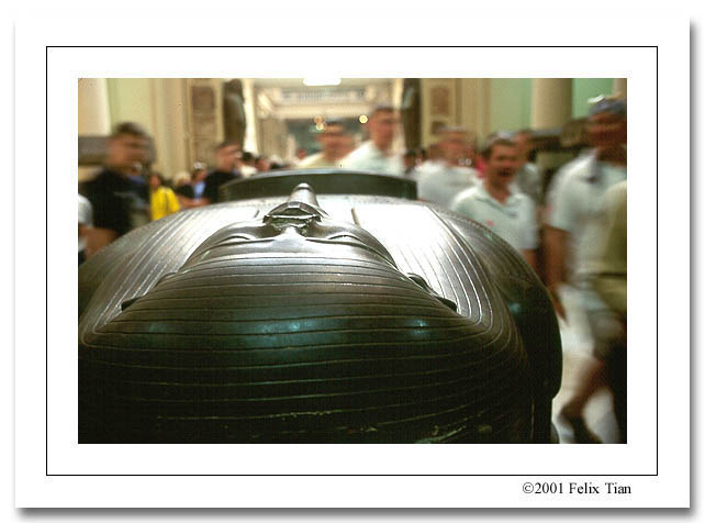 馆内用人声鼎沸来形容一点都不过分,导游们举着小旗,打着手电,带着各国游客挤来挤去。每个角落里都站着黑衣士兵。还有不少小学生在老师的带领下接受爱国主义教育。埃及的孩子们非常可爱,他们长着大大的黑眼睛,透出无比的灵气和聪颖,又带着阿拉伯人血液里的热情奔放。当我蹲在地下换胶卷时,一队小学生经过,每个人都弯下腰,把小脸凑到我面前,眨着好奇的大眼睛,用一听就是学校教出来的英语争着问: