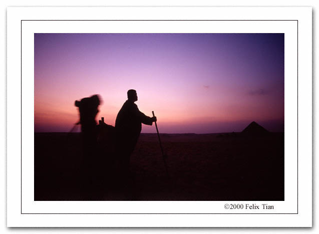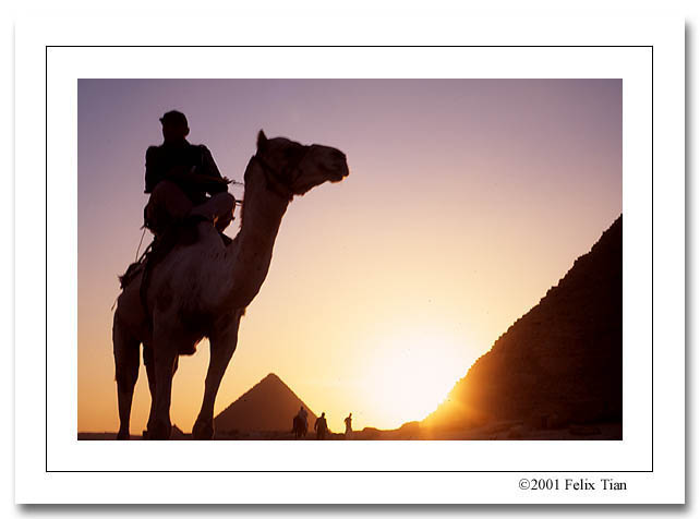 亲热完了之后,阿里往士兵手里塞了点什么,这回士兵坦然接受了。他跨上骆驼,一声吆喝,硕大的骆驼昂然而起。我不禁暗暗喝了声采,那士兵黑衣白骑,横枪其上,衬着远处的金字塔和天边的晚霞,说不出的威风,道不尽的古韵!