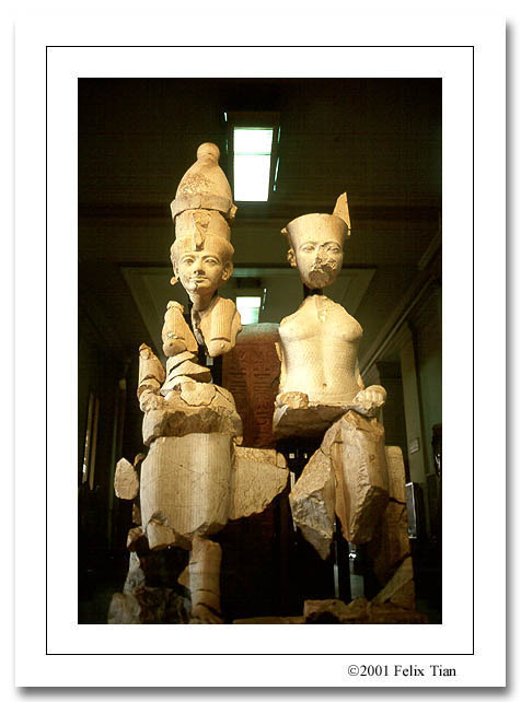 埃及博物馆建立于1863年,二十世纪处移馆至目前的二层建筑物内。经过长长的排队和两道严格的探测器加开包检查,首先映入眼帘的是正对着大门的两尊两层楼高的巨大石像,他们是古埃及著名国王Amenophis III和他的妻子,表情和善安详,颇有太平盛世的国君风范。