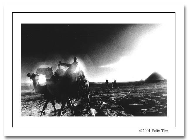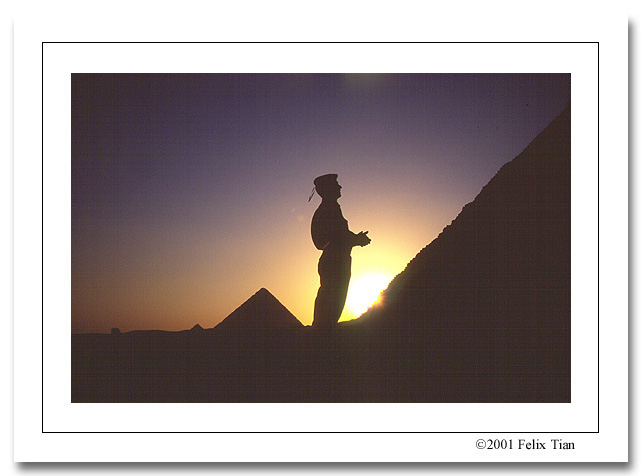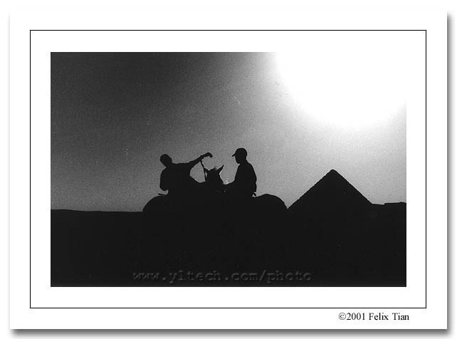 过了五点,金字塔周围只剩下我一个游人,夕阳也近地平线,我把三卷反转烧完,舒了口长气。这时那个小兵又走过来,没等他开口我就说我马上就走,哪儿想到他来了句:“不用急,你照吧,如果愿意我可以带你往里面走,到那个金字塔边上去照。”