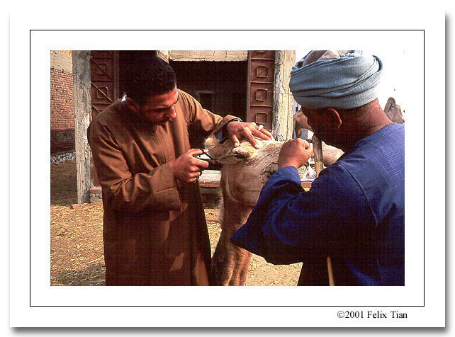 这是个并不很大的集市,粪便遍地,空气中散发着一股尿骚和干饲料的混合味道,我在里面走了不到50米,相机上就沾满了灰尘。市场里面至少有上千头骆驼在交易,这些都是单峰骆驼,一只腿被绑起来,于是只能象袋鼠一般一瘸一拐地跳着走。赶骆驼的人手一只木棍,打起骆驼来毫不留情,他们都着长衫但不包头,皮肤近似黑人。我问了一下,一匹骆驼的寿命约25年,要卖1500美金。