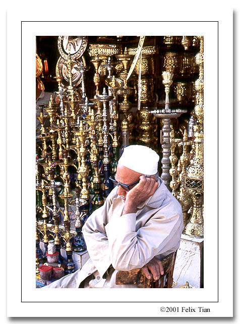 下午两点,我赶到Khanel-Khalili,这是个从十四世纪起就闻名暇迩的超级阿拉伯大集市。从地图上看,Khanel-Khalili的面积比二十个深圳老街或是武汉汉正街还大,纵横交错的狭窄街道被各种五颜六色的商品填得满满的,有铜器,香料,布匹,金银首饰,小石雕,工艺画,波斯地毯,面包,电器 。。。。。。应有尽有,琳琅满目。集市里人声鼎沸,寸步难行,来买东西的绝大部份是当地人。
