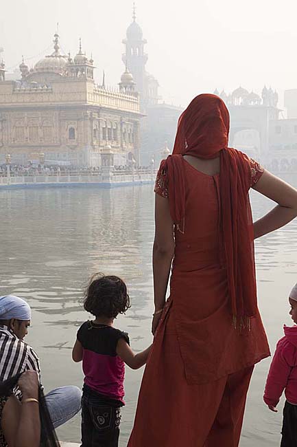 也许是北方人的缘故,锡克族人大都身材高大颀长,比例优美。配着包头蓄着络腮胡子的男人们显得英气十足;裹着五彩沙丽的女子们则是窈窕婀娜,轻盈飘渺。金庙之畔,抬眼尽是赏心悦目的靓丽。