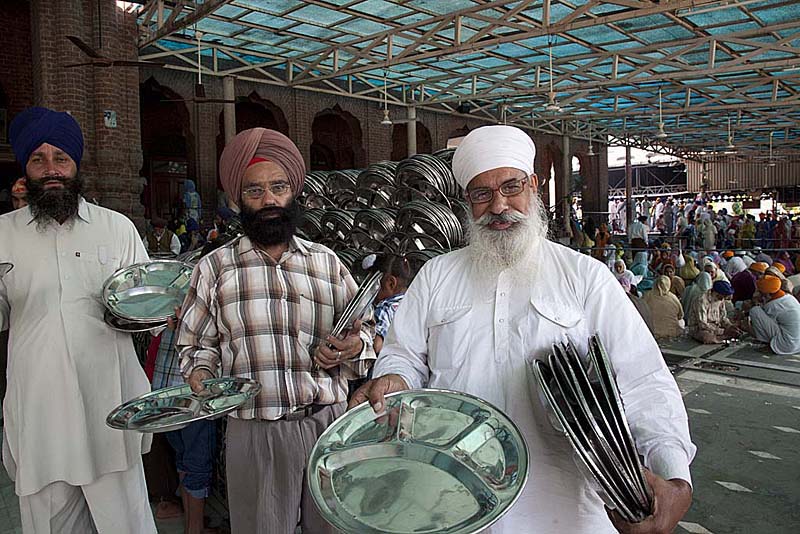 锡克人骁勇善战,在世界各地做保镖、雇佣兵的为数不少。不知为什么,金庙里身着蓝色长袍、橘色包头、手持长矛的寺庙守卫让我不禁想起了林彪麾下的四野。当年,那支来自东北的虎狼之师来不及换装就横扫大江南北,以至于头顶上的皮帽子成了令对手望风而逃的夺命符。