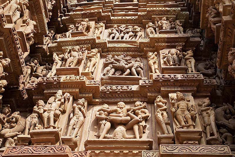 在一个石头庙前下车,走进庭院,尖塔形的庙殿形状古朴奇特,远看外墙上浮雕密布,走近细看,不禁大惊,早就听说过印度、尼泊尔一带存在“性庙”,今日终以得见。