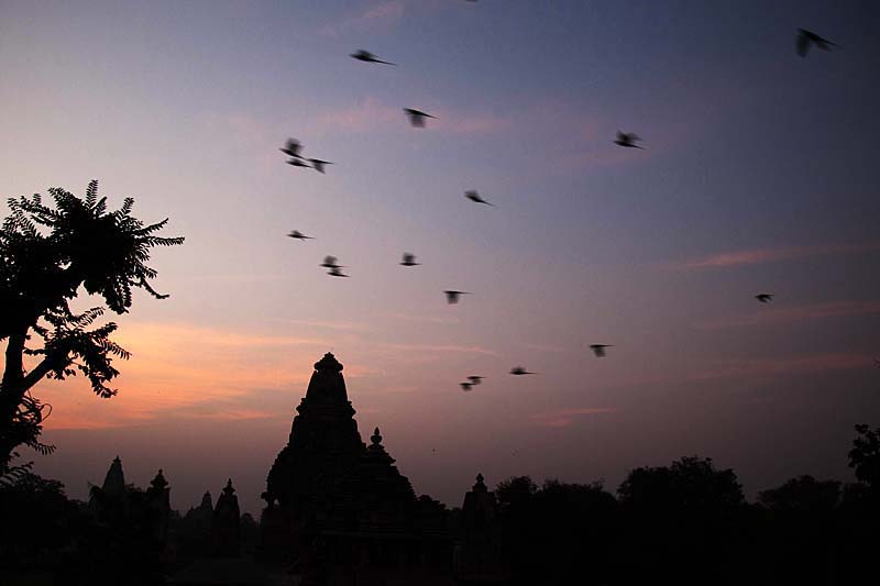 天边一轮红日缓缓滑落至神庙尖顶间,大而圆、红且暖。一群群长尾绿色的鸟儿在神庙间追逐,箭一般飞划而逝,复而折返,蛐蛐声中带着些许凄凉,让我想起“旧时王谢堂前燕,飞入寻常百姓家”的诗句。
